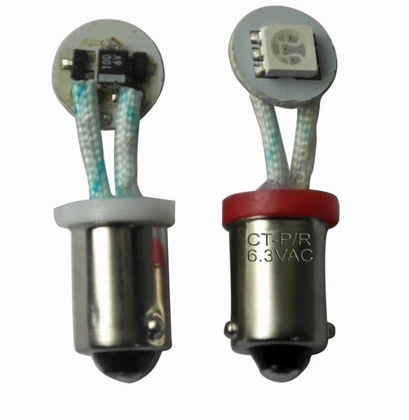 Voltage 6.3 AC or DC, as these are fully rectified. Current is .05 amps for power consumption of .3watts. This is 5 times less power used than a 44 / 555 bulb.