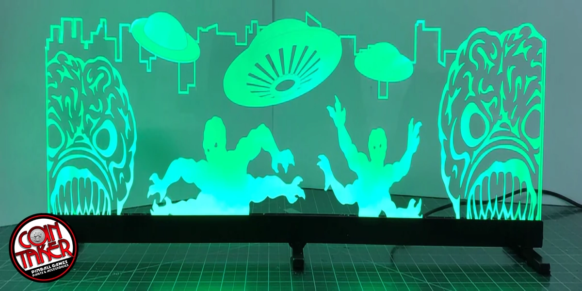 Custom artwork laser etched into acrylic mounted in a welded aluminum low profile frame, our Attack from Mars topper is the finishing touch to your game. Full RGB lighting with controller, installation is very easy to do. This topper can be fitted for the original AFM. please choose which version you have. Topper is 24″ x 7.25″