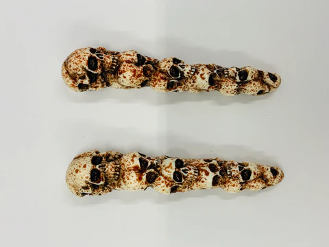 These flipper toppers are a 2pc set. They are bone color with a brown/black wash and then blood splatter added. They attach to the top of the flippers via VHB tape. We recommend that you clean the tops of your flippers with rubbing alcohol before install. *flipper bats not included*