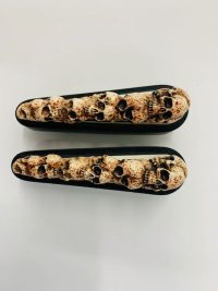These flipper toppers are a 2pc set. They are bone color with a brown/black wash and then blood splatter added. They attach to the top of the flippers via VHB tape. We recommend that you clean the tops of your flippers with rubbing alcohol before install. *flipper bats not included*