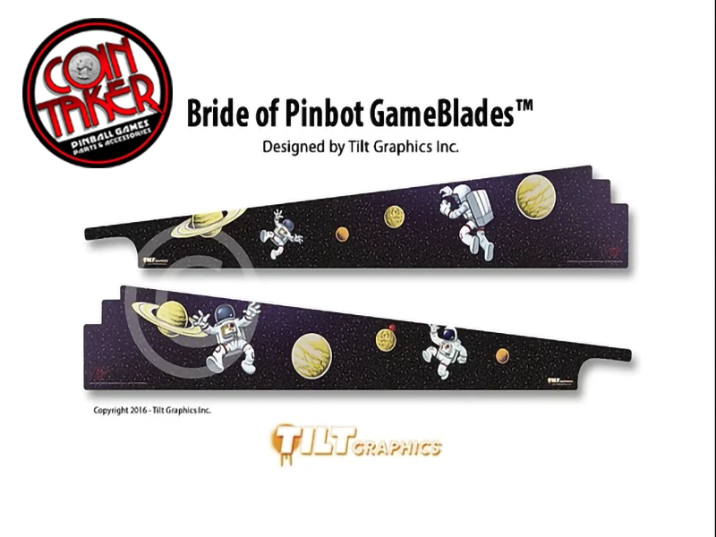 Bride of Pinbot GameBlades™. They install in minutes and are made with only the best air egress vinyl on the market. Air egress vinyl allows you to easily reposition these decals for the perfect fit. Best of all these bad boys are printed and produced here in the USA.