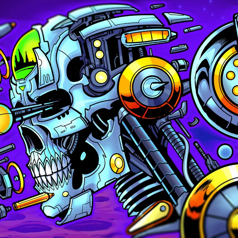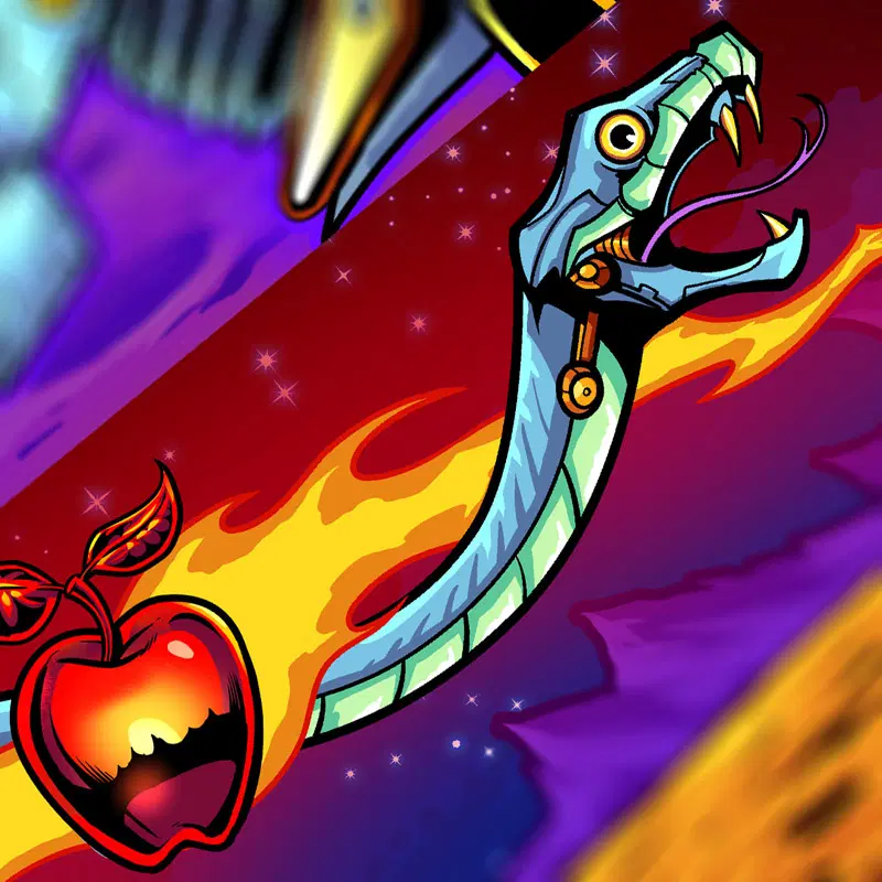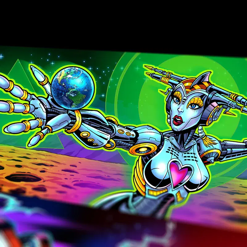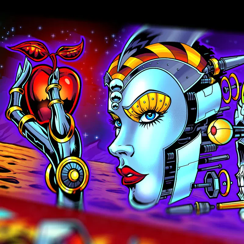 This officially licensed Bride of Pinbot Side Blade decals feature my hand-drawn artwork and are designed to be easily applied to the inner sides of your pinball machine.