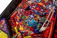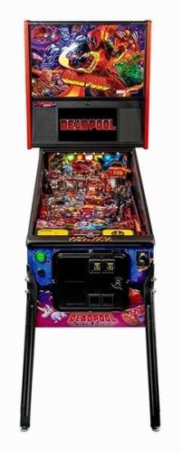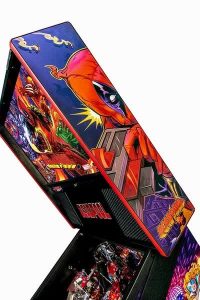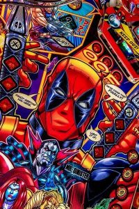 We chose to use comic book art rather than images from the 2 “R” rated (grown up audiences only) 2015 and 2018 movies, each grossing near $1 billion. Deadpool will appear in many more Marvel movies, remaining in the public eye. As great as the movie images are, the comic book style art jumps out. Now famous pinball artist Zombie Yeti made this game bright, colorful and absolutely stunning.