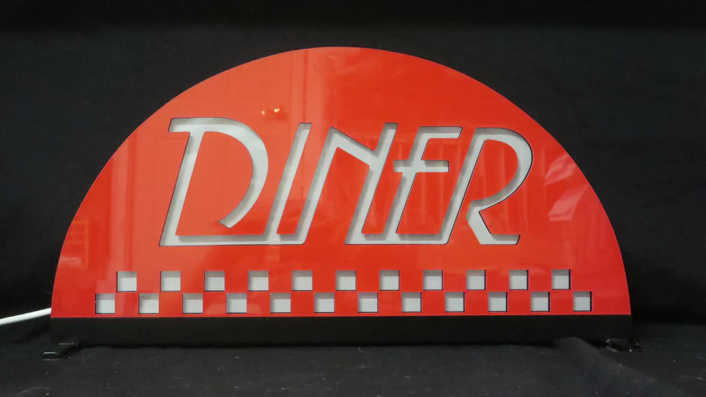 Custom artwork laser etched into acrylic mounted in a welded aluminum low profile frame, our Diner topper is the finishing touch to your game. Featuring a bright red 3D cut out to overlay the etching. Warm white LED’s to remind of the “Diner” era. Topper is 18″ x 9.75″