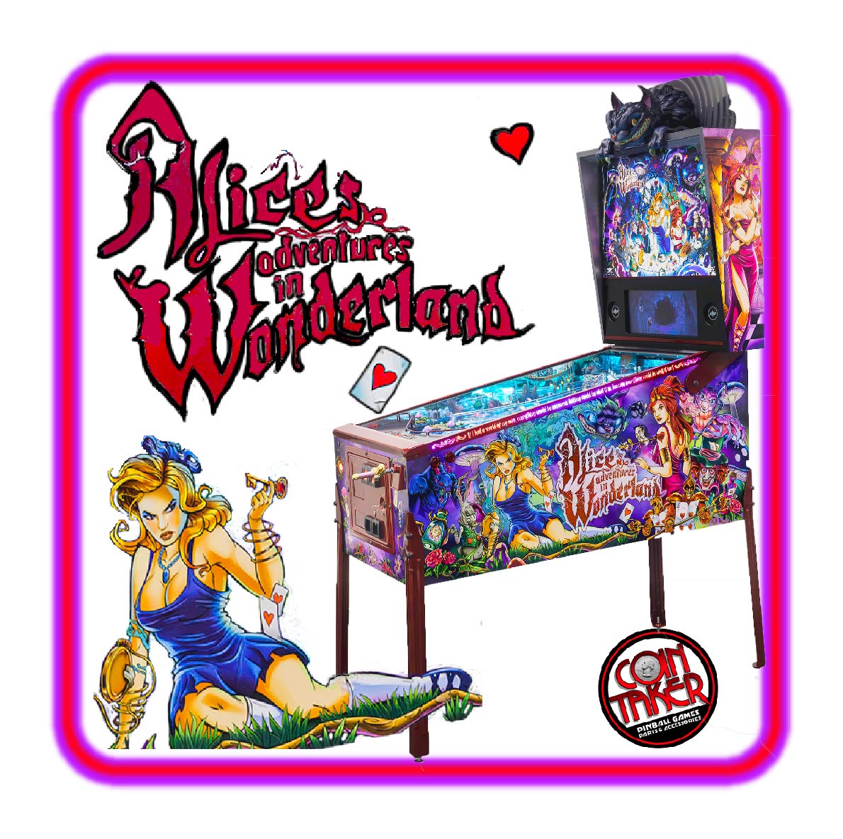 Based on the classic 1865 children’s book by Lewis Carrol, the game’s cabinet, backbox and translite artwork package is based on original line art from the Zidware version, created by Jeremy Packer (a.k.a. Zombie Yeti). Some modifications have been made to that original composition and a rich color palette added.