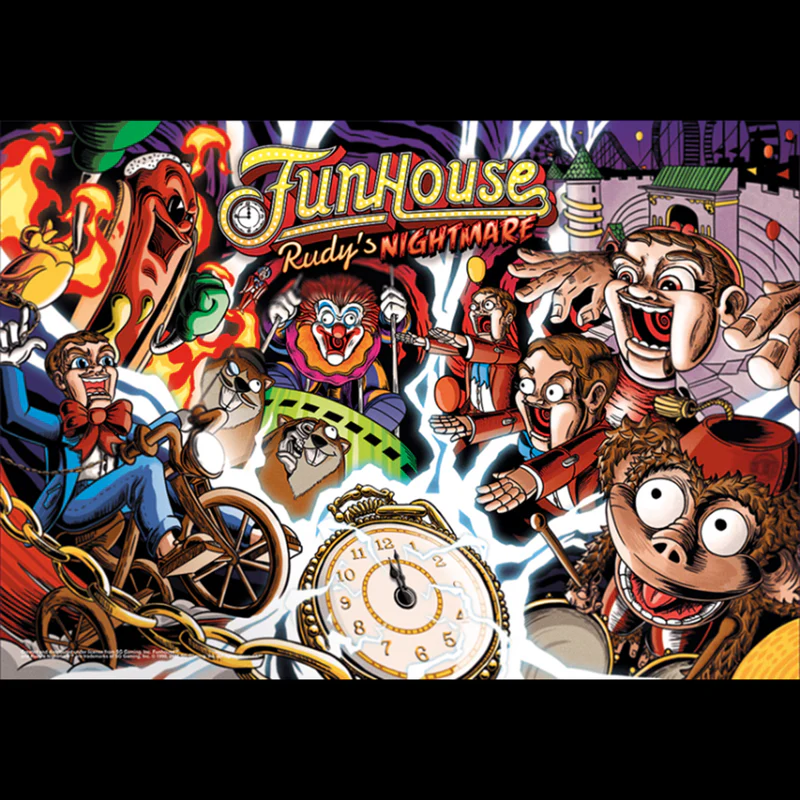 This is an alternate Limited Edition numbered translite / backglass for Rudy’s Nightmare game kit for Funhouse. This is an acrylic translite which will replace the glass/translite on a funhouse or replace the existing translite that comes with the Rudys Nightmare Kit. Each one is numbered and limited to 200 worldwide.