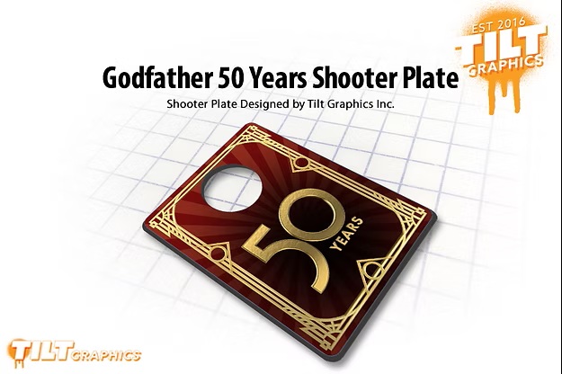 Become part of the family with this custom designed Godfather 50 Years shooter plate. Ths specific shooter plate is two layers of laser etched and cut high density plastics. guaranteed to last the life of your pin and best of all it installs in just a few minutes. Each custom shooter plate is crafted produced here in the USA.