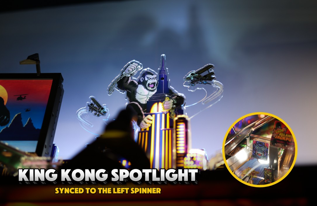 Interactive spotlight tied to the game’s spinners, casting a flashing strobe on King Kong when hit, as well as creating an ominous King Kong shadow on the wall behind the pinball machine. Also creates the same awesome lighting effect at the start of Kong Multiball and other modes.