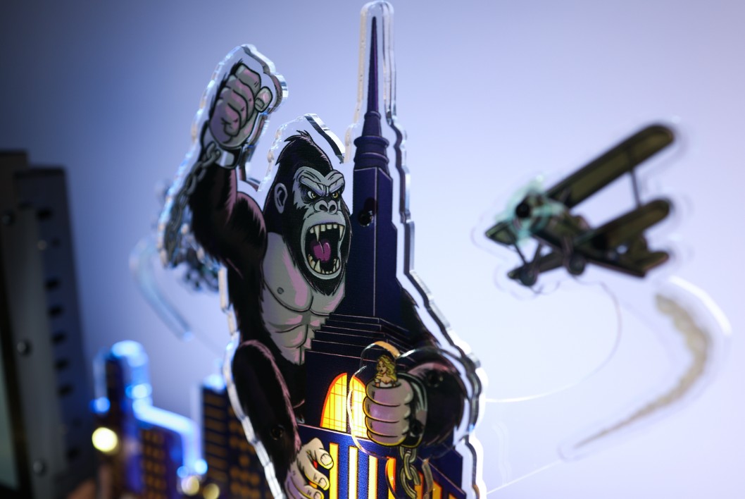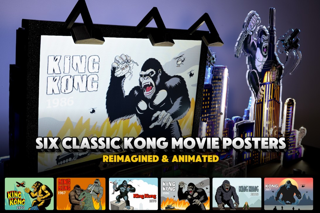 The digital display features animated recreations of 6 classic King Kong Movie posters, ranging from 1933 to 2015, playing on a looping cycling.