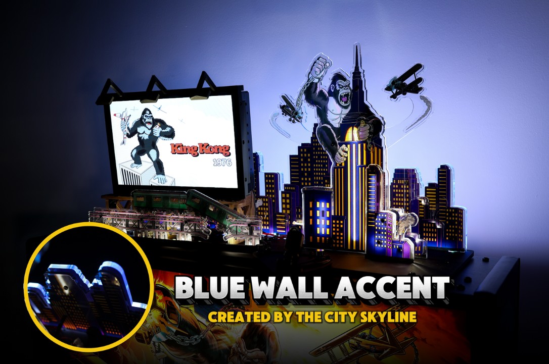 Featuring iconic imagery and artwork that matches the game and a dynamic, interactive lighting experience that illuminates the city skyline as well as your gameroom. Rip those spinners and see an interactive spotlight light up Kong on top of the Empire State Building casting a cool strobing shadow effect onto your gameroom’s wall!