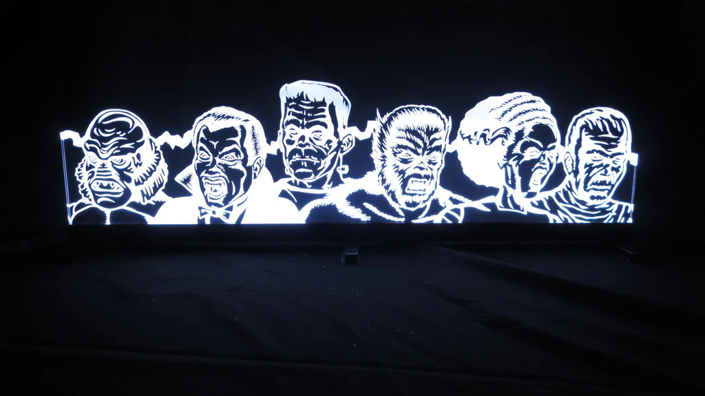 Custom artwork laser etched into acrylic mounted in a welded aluminum low profile frame, our Monster Bash topper is the finishing touch to your game. Full RGB lighting with controller, installation is very easy to do. Topper is 24″ x 6.5″