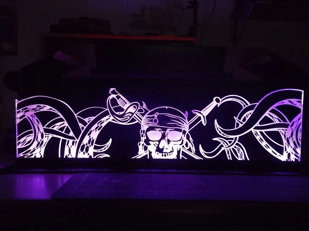 Custom artwork laser etched into acrylic mounted in a welded aluminum low profile frame, our Pirates of the Caribbean topper is the finishing touch to your game. Full RGB lighting with controller, installation is very easy to do. Topper is 24″ x 6.75″