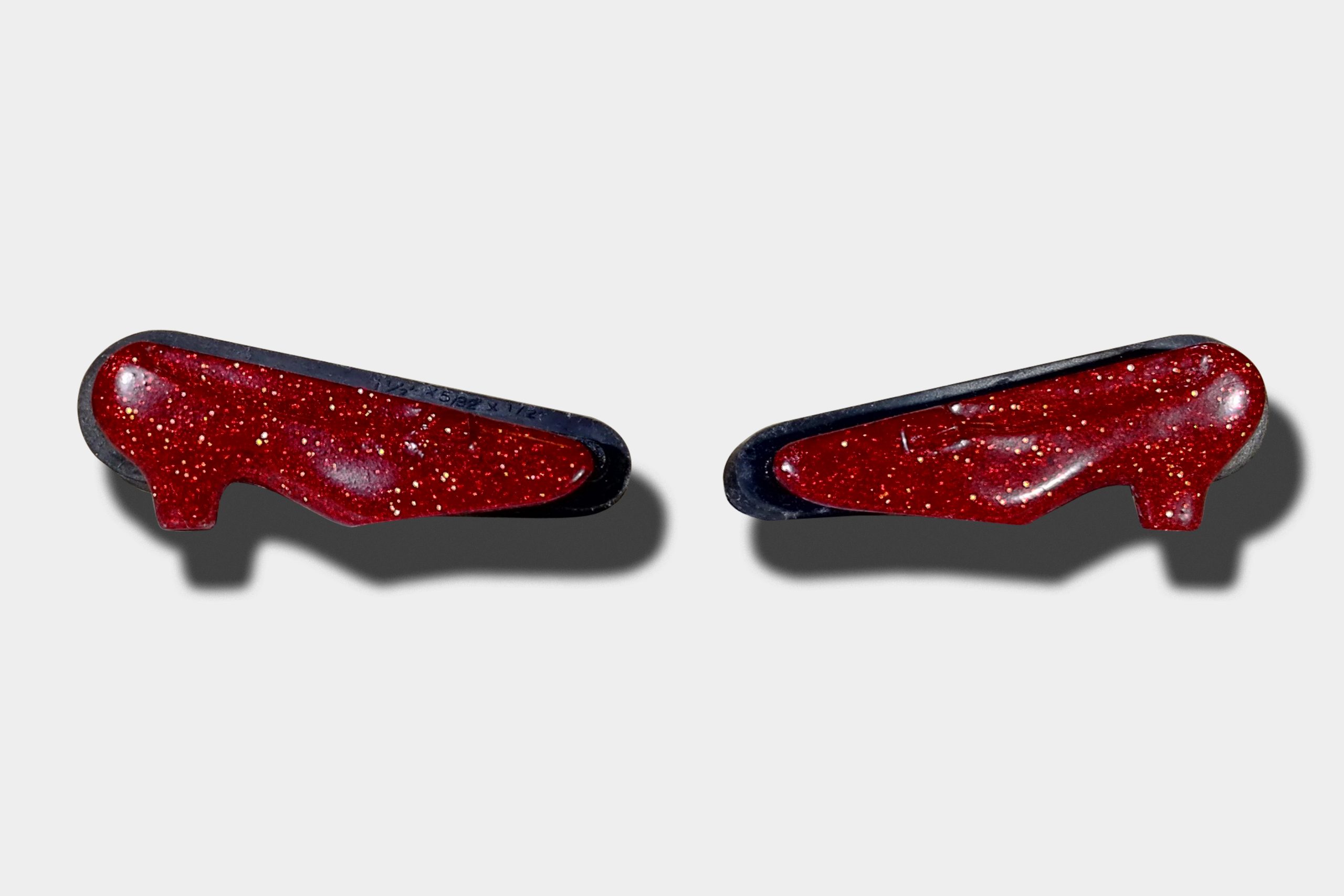 This flipper bat, set of two flippers, is all black with the Ruby Red slippers mounted to them.