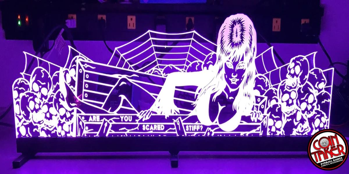 Custom artwork laser etched into acrylic mounted in a welded aluminum low profile frame, our Scared Stiff topper is the finishing touch to your game. Full RGB lighting with controller, installation is very easy to do. Topper is 24″ x 6.75″
