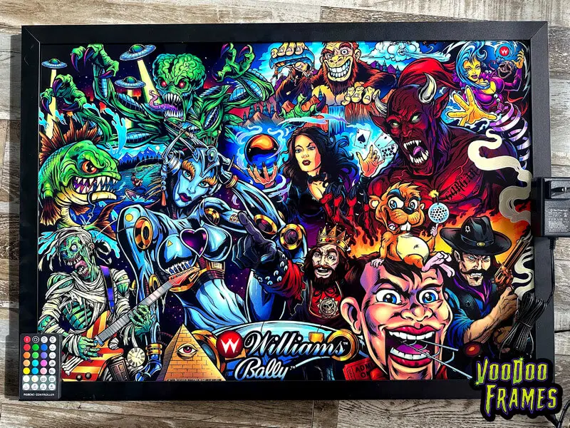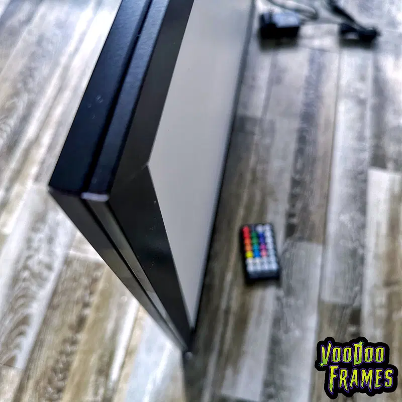 Black metal frame edges snap up and down so you can effortlessly install plastic Translite or paper artwork inside. Comes with a clear plexiglass cover to protect your artwork.