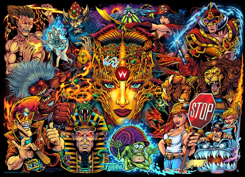 Featuring hand-drawn characters from 14 different classic Williams Pinball games, including: Firepower, Black Rose, Road Show, Cyclone, Pharaoh, Dr. Dude, Earthshaker, Swords of Fury, Algar, Laser Cue, Time Fantasy, Barracora, Flash, and Sorcerer.